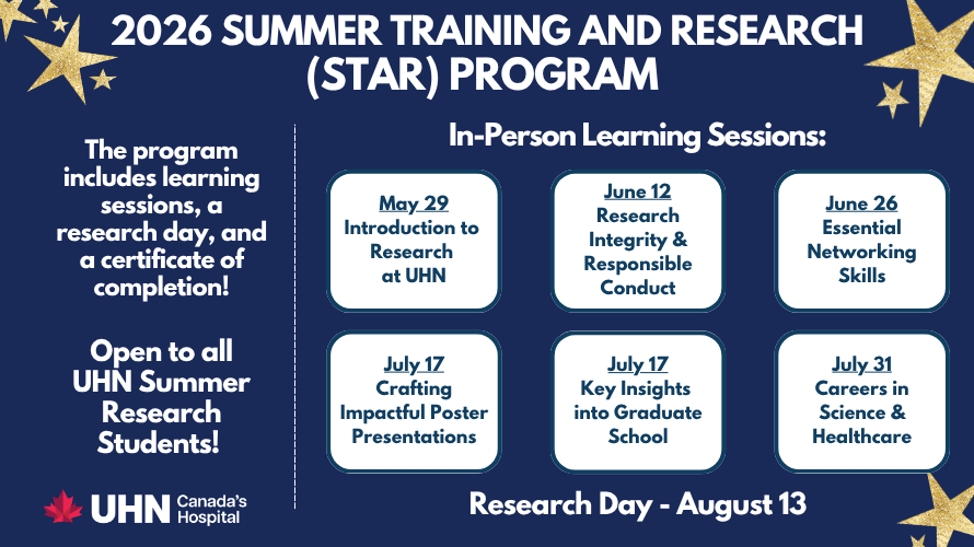 The Summer Training and Research (STAR) Program is offered by the UHN Office of Research Trainees (ORT) and is designed to enhance the UHN summer student experience by providing opportunities to develop research and professional development skills. The program includes 6 interactive learning sessions, an opportunity to present at a UHN-wide research day, and a certificate of program completion.