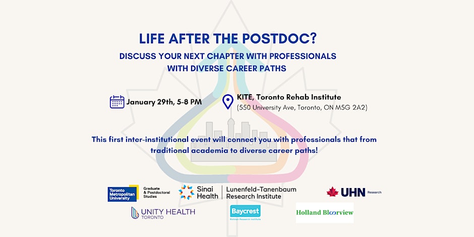Are you wondering what life looks like after the postdoc? Join our round-table discussions with professionals with diverse and rewarding careers outside of academia. The event will be held on Thursday, January 29th, 2026, from 5PM to 7PM (+ optional networking hour) in the KITE Auditorium of the Toronto Rehabilitation Institute (550 University Ave, Toronto, ON M5G 2A2).