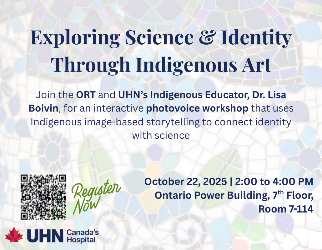 Join the Office of Research Trainees and UHN Indigenous Educator and Dene Artist, Dr. Lisa Boivin, for an interactive and in-person photovoice workshop for a showcase of Indigenous image-based storytelling and how it can be utilized to reflect on a share personal experiences and science!