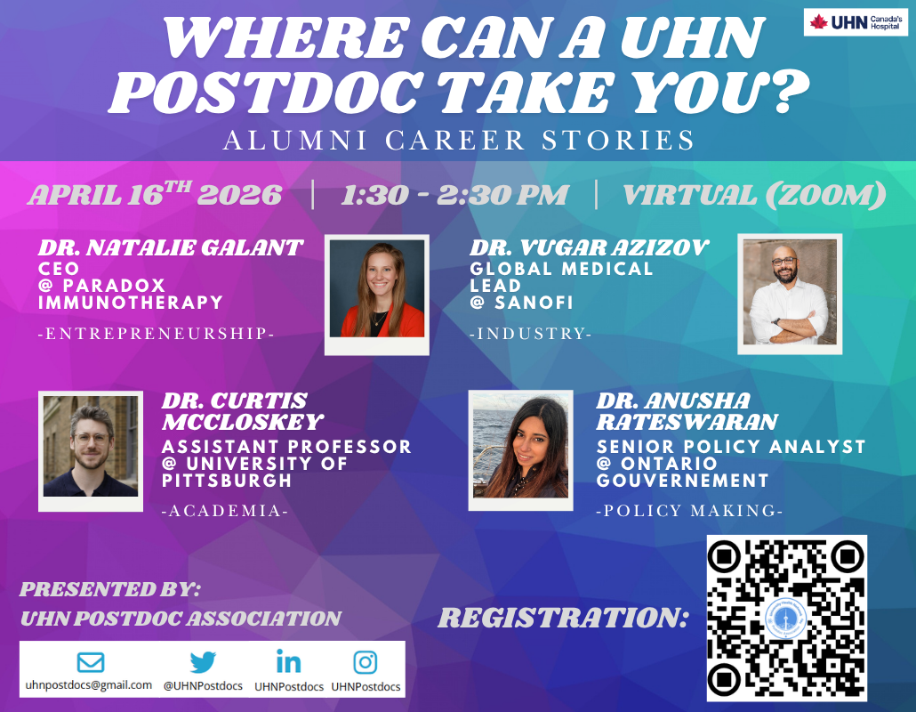 Always wondered what comes after your postdoc at UHN? Join the UHN Postdoc Association (UHNPA) for a virtual career panel featuring UHN postdoc alumni who have pursued diverse and impactful careers.