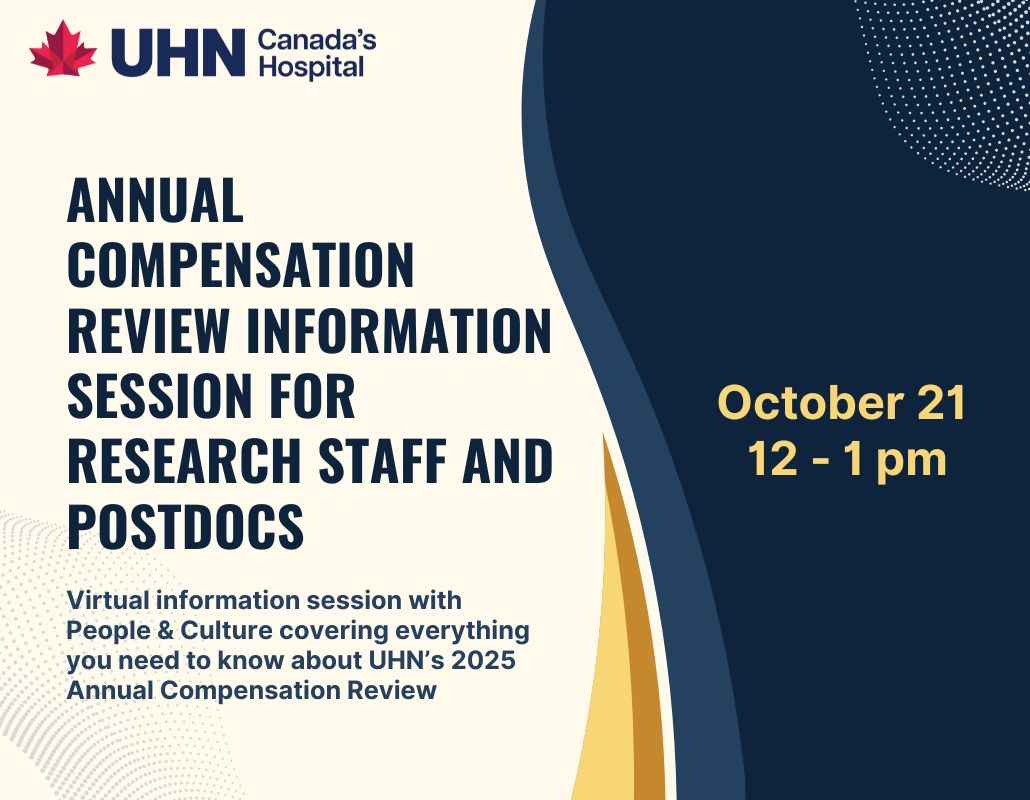 Join the Office of Research Trainees and the Research Professionals @ UHN (RP@UHN) for a virtual information session on UHN’s 2025 Annual Compensation Review (ACR) on October 21, 2025 from 12:00 to 1:00 PM on Microsoft Teams. UHN Research’s People & Culture team will review everything research staff (including postdoctoral researchers) should know about the 2025 ACR and will answer audience questions.